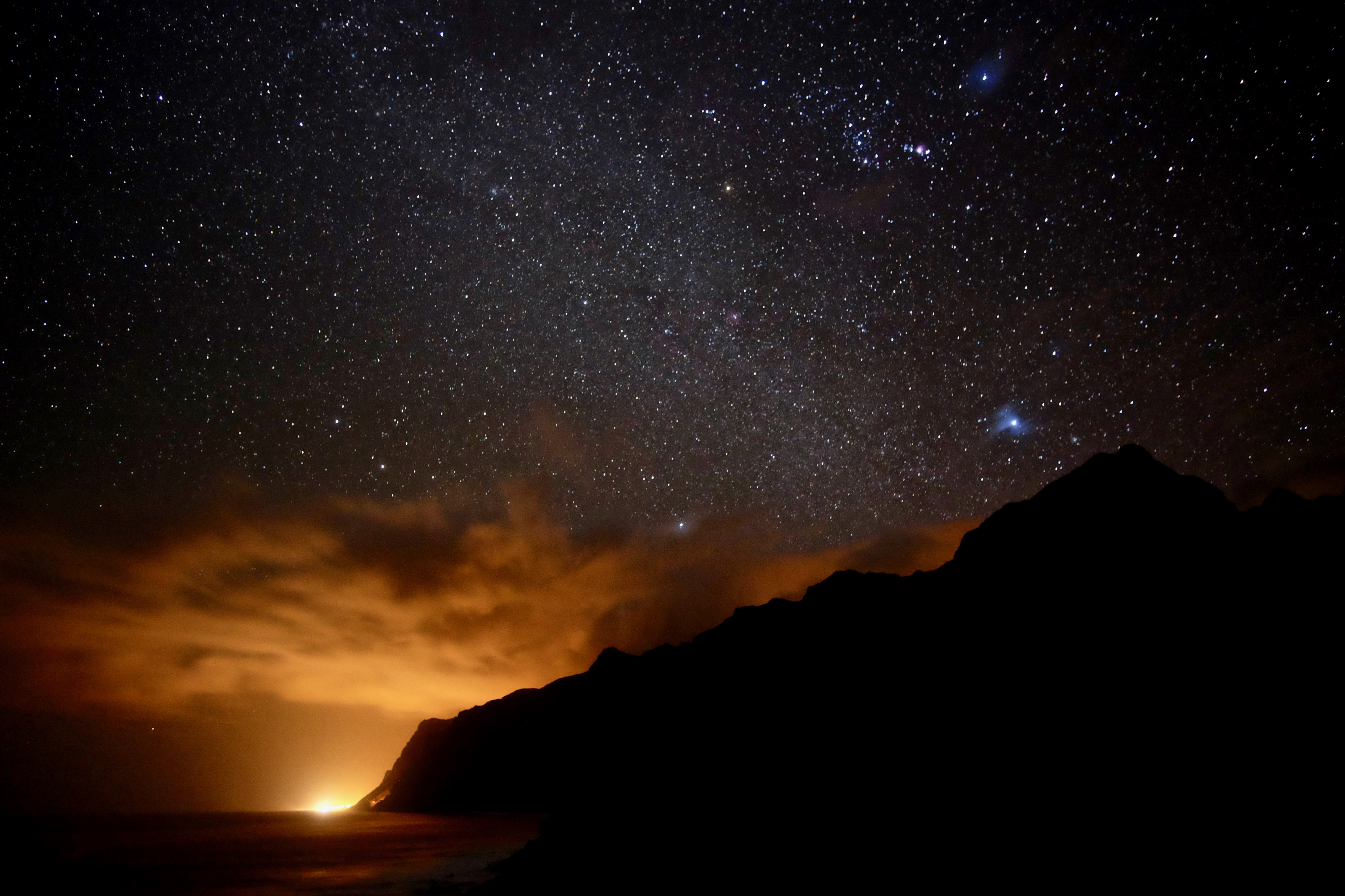 Bild: In abgelegenen Gebieten wie auf der Insel Santo Antão beleuchtet fast ausschließlich Sternenlicht die Nacht. Bereits das sehr schwache elektrische Licht eines kleinen Dorfes, das die Wolken von unten beleuchtet, ist ungefähr 10.000 mal heller als das Sternenlicht.